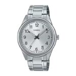 Casio MTP-V005D-7B4UDF klasični muški sat s elegantnim srebrnim kućištem i narukvicom od nehrđajućeg čelika. Bijeli brojčanik s jednostavnim oznakama pruža sofisticiran izgled i izvrsnu čitljivost. Idealan za svakodnevnu eleganciju.
