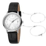 Esprit ES1L181L2015 — elegantan ženski sat u srebrenom tonu sa bijelim brojčanikom i crnim kožnim kaišem, upotpunjen nježnim sjajnim detaljima. Djeluje profinjeno i damski, idealan kao elegantan modni dodatak za svaki dan.
