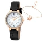 Esprit ES1L228L2075 — elegantan ženski sat u ružičasto-zlatnom tonu sa bisernim bijelim brojčanikom i crnim kožnim kaišem, upotpunjen nježnim sjajnim detaljima. Djeluje profinjeno i romantično, savršen kao damski modni dodatak za svaki dan.