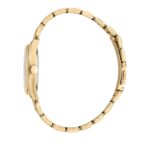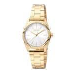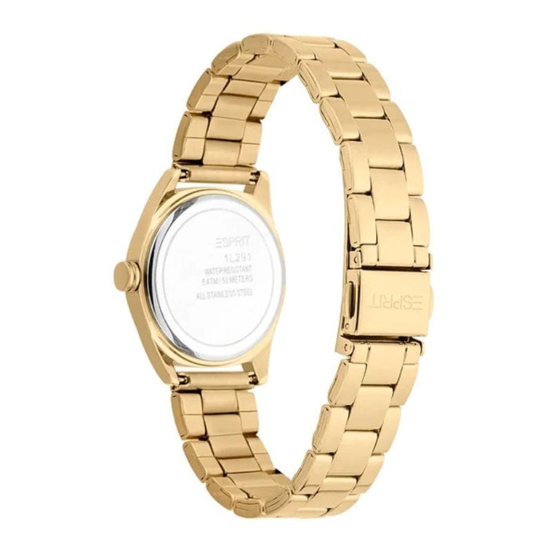 Esprit ES1L291M0095 je elegantan ženski ručni sat koji kombinuje klasičan dizajn s modernim detaljima. Njegovo kućište i narukvica izrađeni su od nehrđajućeg čelika u zlatnoj boji, pružajući sofisticiranu estetiku. Sat ima bijeli brojčanik s minimalističkim oznakama, što doprinosi njegovom suptilnom izgledu.