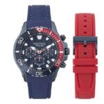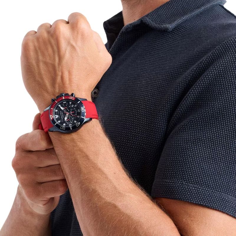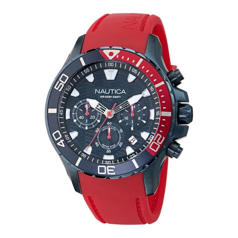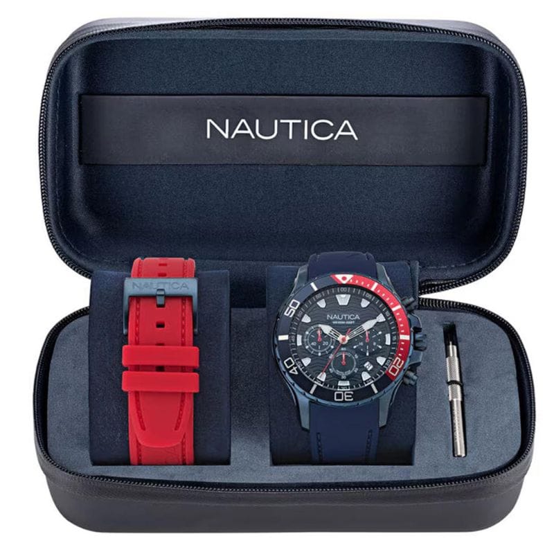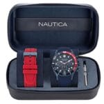 Pročitaj višeNautica NAPNSS505 – Muški hronograf sat s crnim brojčanikom i sportskim bezelom u crveno-plavoj kombinaciji. Dolazi sa dva zamjenjiva silikonska remena (plavi + crveni). Vodootpornost 100 M i robustan dizajn čine ga idealnim za aktivan stil i avanturu.