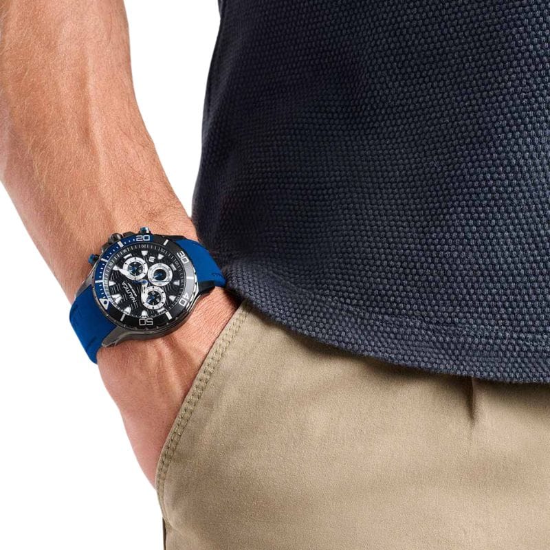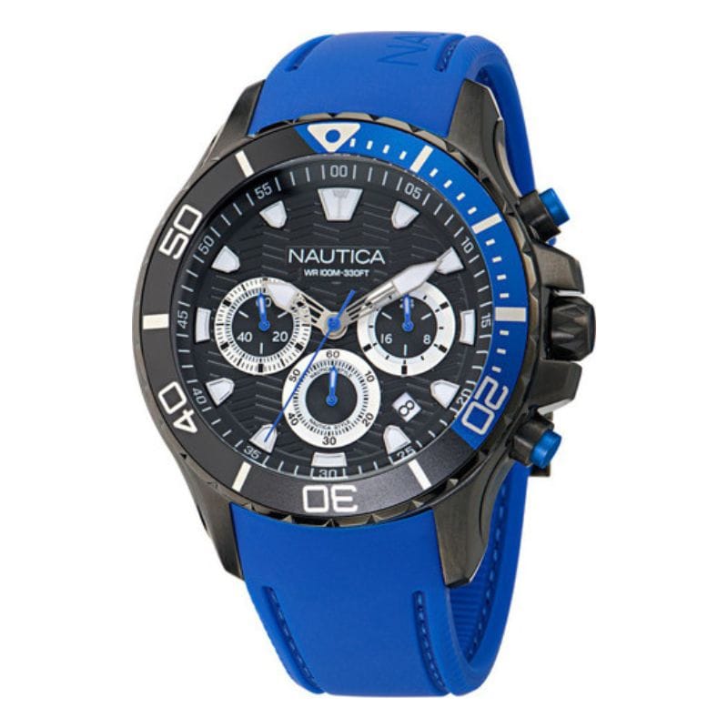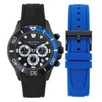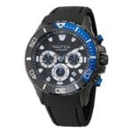 Pročitaj višeNautica NAPNSS506 – Muški hronograf sat u crnoj izvedbi s plavim sportskim detaljima i zamjenjivim silikonskim remenima (crni + plavi). Vodootpornost 100 M i robusni bezel čine ga idealnim za aktivan stil i svakodnevnu upotrebu.