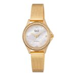 Q&Q C80A-004PY luksuzan ženski sat sa zlatnim kućištem i narukvicom u mesh stilu. Sjajni cirkoni oko okvira i na brojčaniku dodaju dozu glamura, dok sedefasti brojčanik unosi profinjenost.
