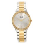 Q&Q Q75B-006PY elegantan ženski sat sa srebrnim brojčanikom, ukrašenim zlatnim detaljima i kućištem obrubljenim cirkonima. Dvo-tonska narukvica u zlatnoj i srebrnoj boji daje mu luksuzan izgled, savršen za svečane i svakodnevne prilike.